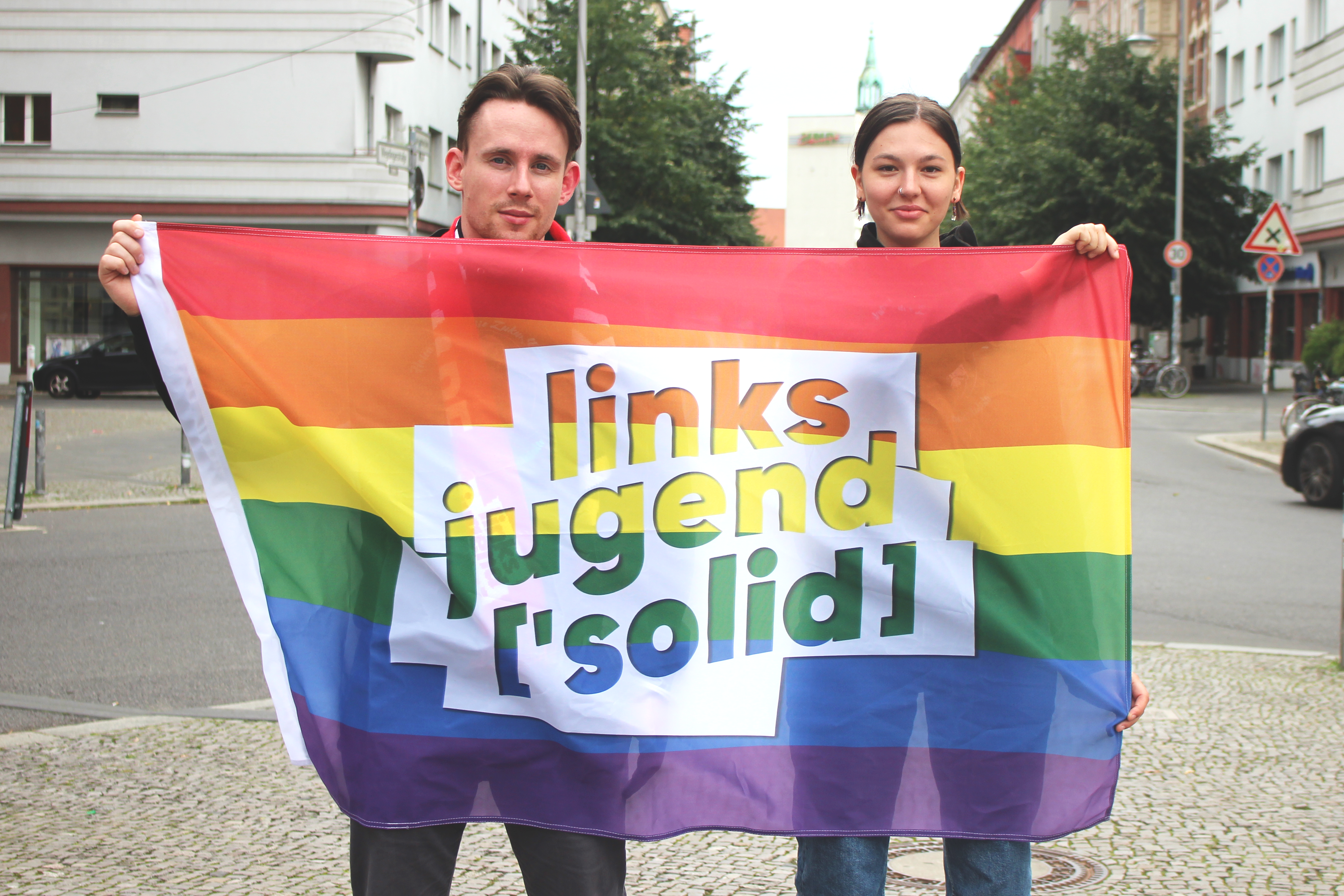 Mit der Regenbogenflagge im Format 150cm x 100cm mit weißem Verbandslogo kann deine Basisgruppe Präsenz bei der nächsten Demo oder beim Infostand zeigen. Am linken Rand ist ein Saum für eine Fahnenstange eingenäht, damit du die Flagge auch gut schwenken kannst.